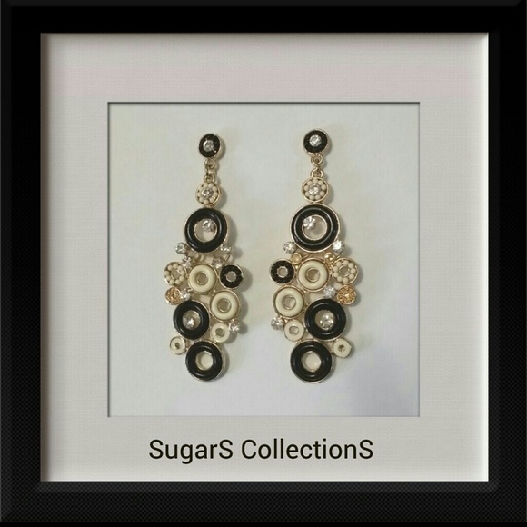 Black & Cream circles with black & cream stones and clear crystals. 3in in length